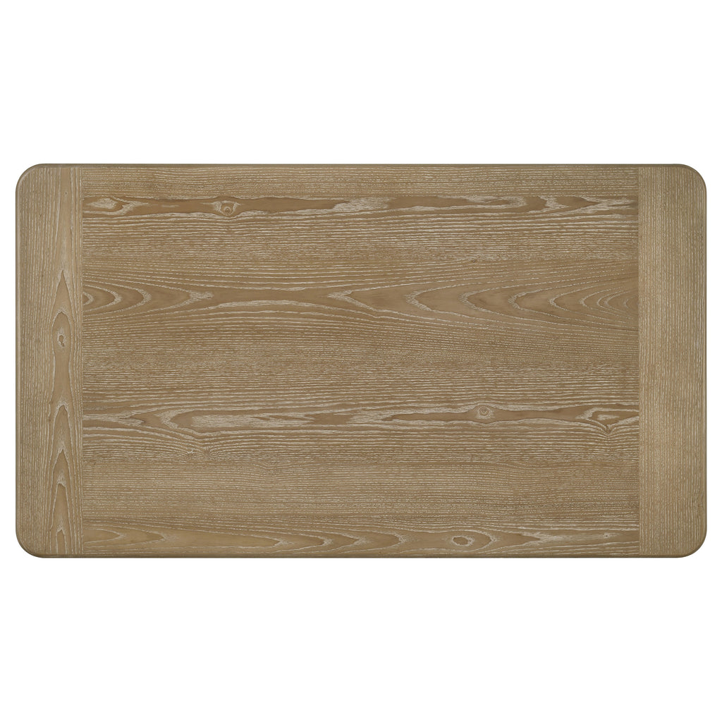 This rectangular coffee table brings sculptural structure and natural warmth to any living room. The rounded-edge tabletop rests on dual curved pedestal bases, each detailed with vertical reeding for visual rhythm and balance. Finished in a distressed light brown tone, the piece blends organic texture with architectural design. Built from engineered wood and ash veneer, this coffee table serves as a grounding focal point for contemporary and transitional spaces. Key Features: • Rectangular coffee table with softly rounded corners and smooth top • Distressed light brown finish emphasizes the wood's tonal variation • Dual curved pedestal base panels feature vertical reeding detail • Broad surface area provides functional space for decor and daily use • Made from engineered wood and ash veneer for durability and style • Ideal for modern or transitional living rooms seeking warmth and form
