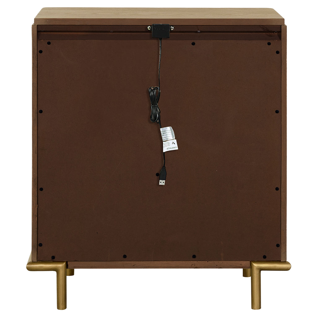 Retro charm meets modern function in this three-drawer nightstand, featuring a warm sand wash finish with subtle wire-brushed texture. Round aged brass knobs and matching tubular metal legs add a hint of glamour, while a built-in dual USB port offers convenient bedside charging. The top felt-lined drawer keeps delicate items safe, blending timeless mid-century aesthetics with everyday practicality for a refined and functional bedroom accent._x005F_x000D_ Key Features: • Three-drawer nightstand with soft sand wash wire-brushed finish • Aged brass knobs and metal legs enhance its mid-century appeal • Top drawer lined with felt to protect delicate items • Built-in dual USB ports for convenient bedside charging • Crafted from rubberwood, engineered wood, and ash veneer • Elegant rounded corners and tubular legs add modern balance