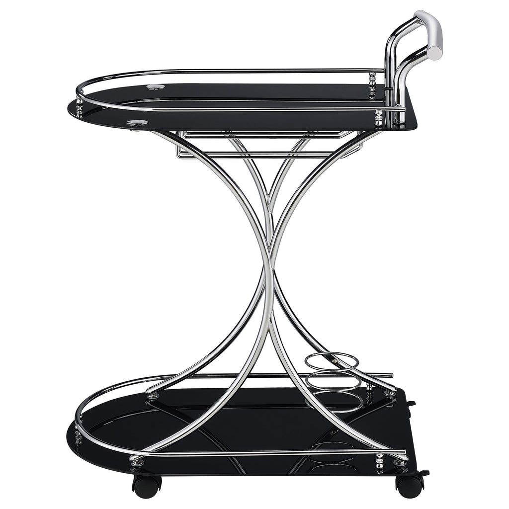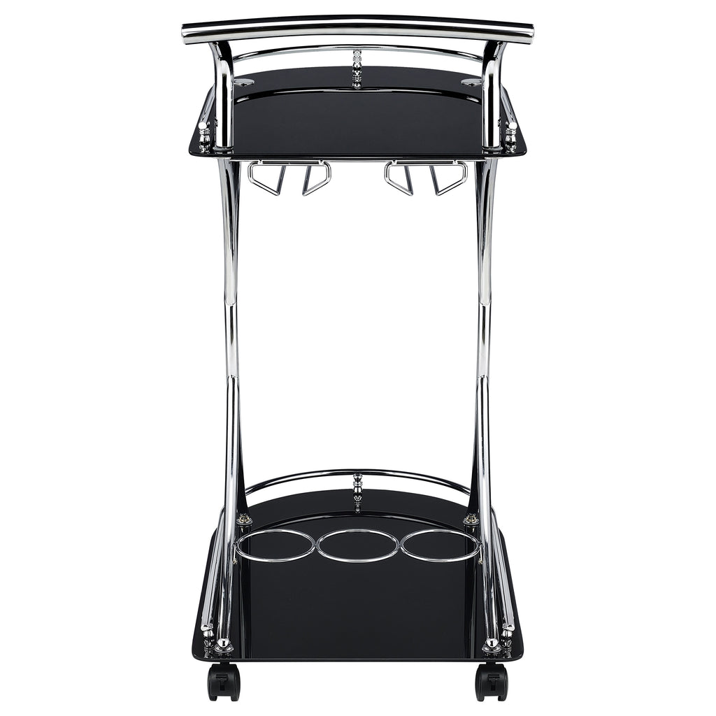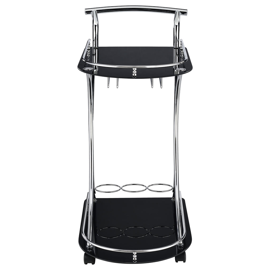 Recapture mid-century elegance with an enticing function. Slender construction elements form a graceful look in this mobile serving cart and add a lovely accent piece that's also useful for entertaining. Sleek black glass serves as a top and bottom shelf, contributing to an upscale flavor. Chrome finish metal accents round out a luscious palette. Serve and store with a pair of wine bottle holders and a stemware rack. Key Features: • Two-tier bar cart with black tempered glass shelves and chrome metal frame • Curved chrome silhouette creates sleek contrast against dark shelf surfaces • Integrated stemware rack and wine bottle holder keep essentials secure • Raised guardrails on each tier offer added safety while serving or moving • Smooth-rolling casters include locking function for stable placement • Crafted from steel and tempered glass for modern durability and style