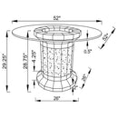 Invite over a few guests to celebrate at this modern glam dining table. A round, clear glass top reveals the scintillating column-inspired pedestal frame beneath, offering an open and airy look. Sparkling faux diamonds are encrusted within the base for a luxe touch. Defining the flush bottom base and the top is a gleaming mirror tile trim that reflects its surroundings effortlessly. Slide up each of the four velvet upholstered side chairs and enjoy a restful dining experience with their tall backrests and rolled tops.