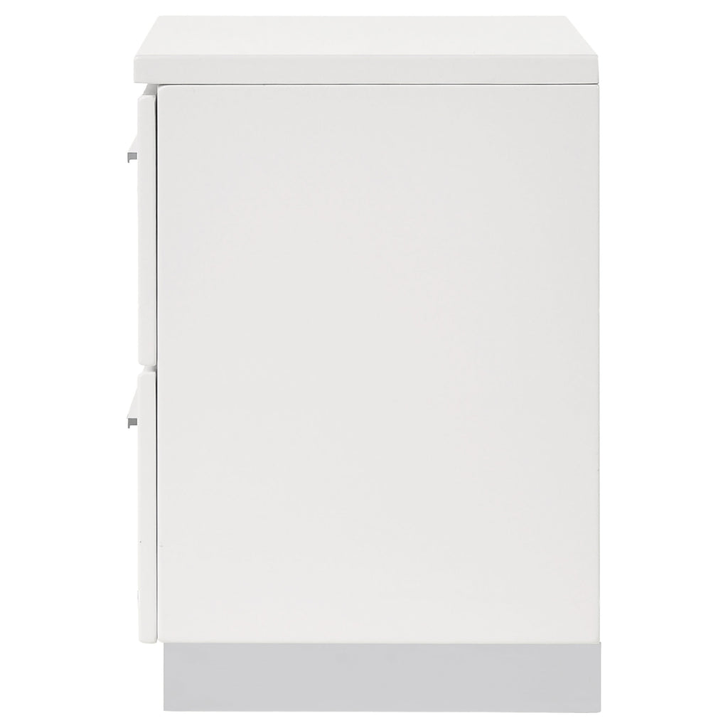 Add functional style to your bedroom with this modern 2-drawer nightstand. Finished in a bright white high gloss, it offers a clean, polished look that complements contemporary interiors. Chrome-finished metal handles and feet provide a refined accent, while metal extension glides ensure smooth drawer operation. Designed for everyday use, this compact storage unit blends durability with a sleek aesthetic. Key Features: • Contemporary nightstand with a clean and streamlined silhouette • White high gloss finish provides a bright, polished modern appearance • Includes two drawers for convenient and organized bedside storage • Chrome-finished metal handles and feet enhance the sleek design • Drawers feature smooth metal extension glides for easy functionality • Built for lasting use with a compact and durable construction