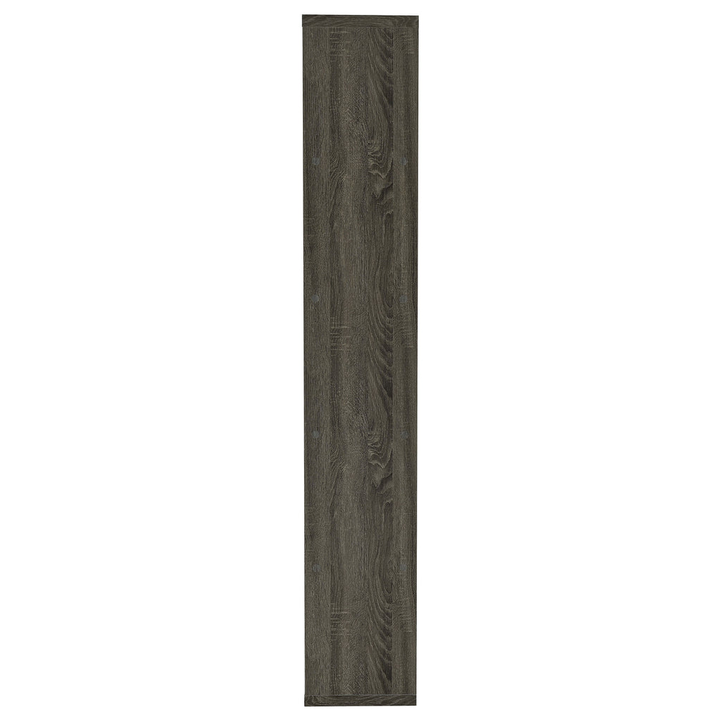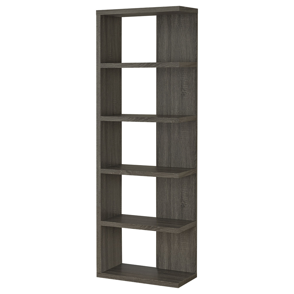 Add a touch of modern charm to any room with this stylish bookshelf in a weathered grey finish. Designed with a mix of open and backed shelving, it brings visual intrigue and versatility to your storage needs. Crafted from engineered wood and finished in eco-friendly melamine veneer, this unit offers five spacious tiers perfect for books, décor, and keepsakes in a contemporary home office or living space. Key Features: • Modern bookshelf with five staggered shelves for stylish organization • Weathered grey finish adds a rustic yet contemporary visual appeal • Open-end shelf design provides dimension and lightness to the silhouette • Ideal for displaying books, framed photos, or small potted plants • Made of engineered wood with a durable melamine veneer for longevity • Compact footprint suits apartments, home offices, or cozy reading corners