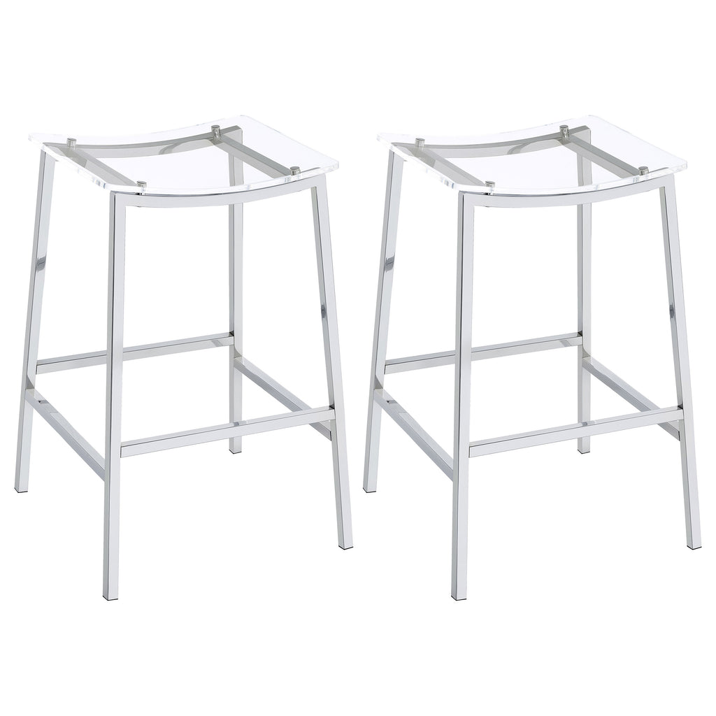 Updated to reflect the carefree contemporary style you crave, this set of two bar stools uses modern materials and finishes to bring a crisp look. Perfect for casual seating at a bar table or counter, these stools are lightweight yet sturdy. Gleaming chrome finish metal framing includes a two-bar seat support and built-in footrests. A gently curved seat made of acrylic reveals the nuts and bolts of metal framing. Add this bar stool set to your easy-living space for entertaining and family meals. Key Features: • Enjoy a casual modern entertaining experience in your home • Set of two pub-height bar stools with ultra-contemporary design • Gleaming chrome finish with two-bar seat support and built-in footrests • Gently curved acrylic seat reveals intricate metal framing details • Adds a carefree contemporary style to any easy-living space