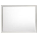 Encourage a glam vibe in your refined bedroom with a modern four-piece bedroom set. Centering on a stylish bed with an upholstered headboard and low footboard, the set includes a two-drawer nightstand for easy bedside storage and display space. A seven drawer dresser and mirror complete the set, adding diamond-like trim across its face that catches the light and offers a sophisticated touch. Bracket feet add a touch of dimensionality and movement to each piece and jewel-like bar pulls add intriguing sparkle. A cool white finish is textured, while white finish trim is smooth, creating a touch of textural contrast that add engaging style.