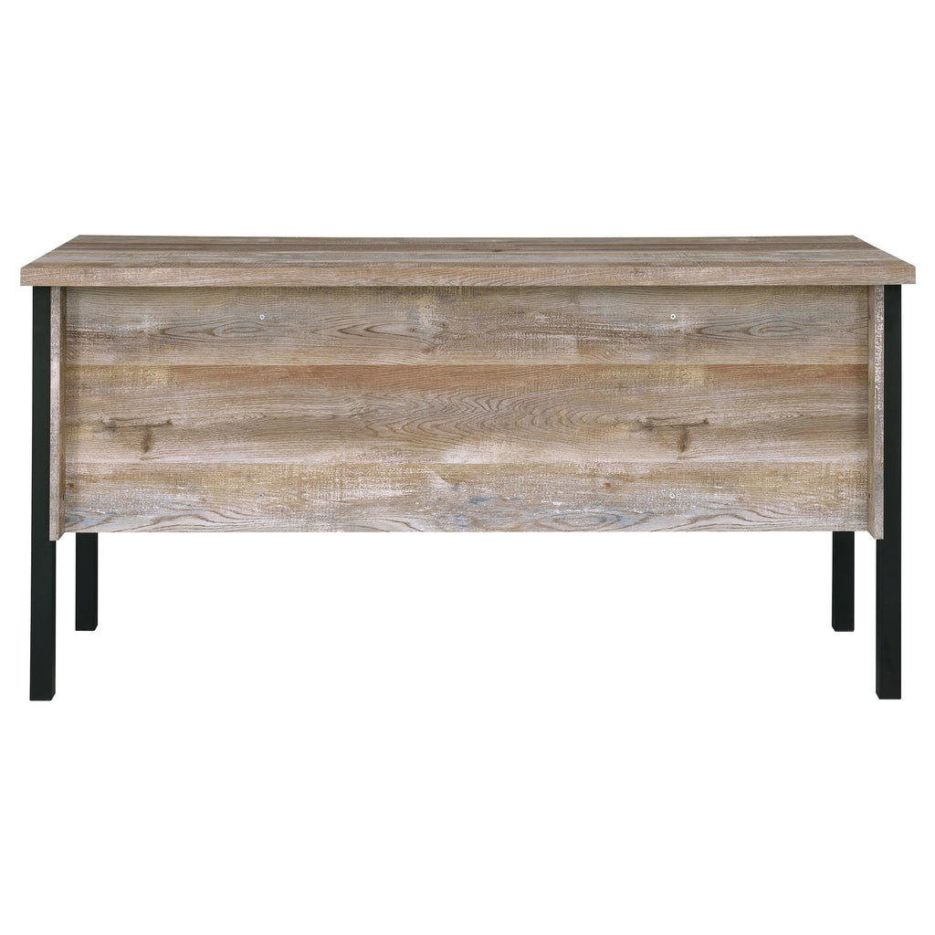 Infuse your office space with stylish simplicity. With a rustic, aged oak finish, this office desk exudes classic charm. Its strong silhouette is brought to life by crisp, clean lines of bold, black metal. Complete with five spacious storage and file drawers, this desk makes it easy to stay organized. Complete with euro glides and high-quality craftsmanship, it's the ultimate in durable practicality. Key Features: • Industrial-inspired office desk with weathered oak top and black metal frame • Includes four drawers and one cabinet for storage and organization • Engineered wood top offers spacious work surface with laminate coating • Flat black drawer pulls complement minimalist modern styling • Ideal for home offices needing concealed file and supply space • Durable, functional design supports both remote work and study setups