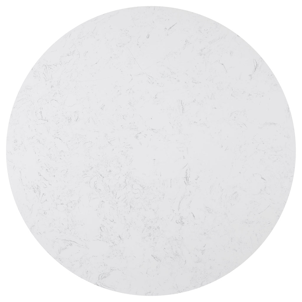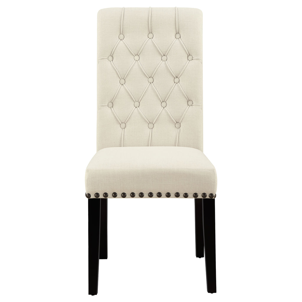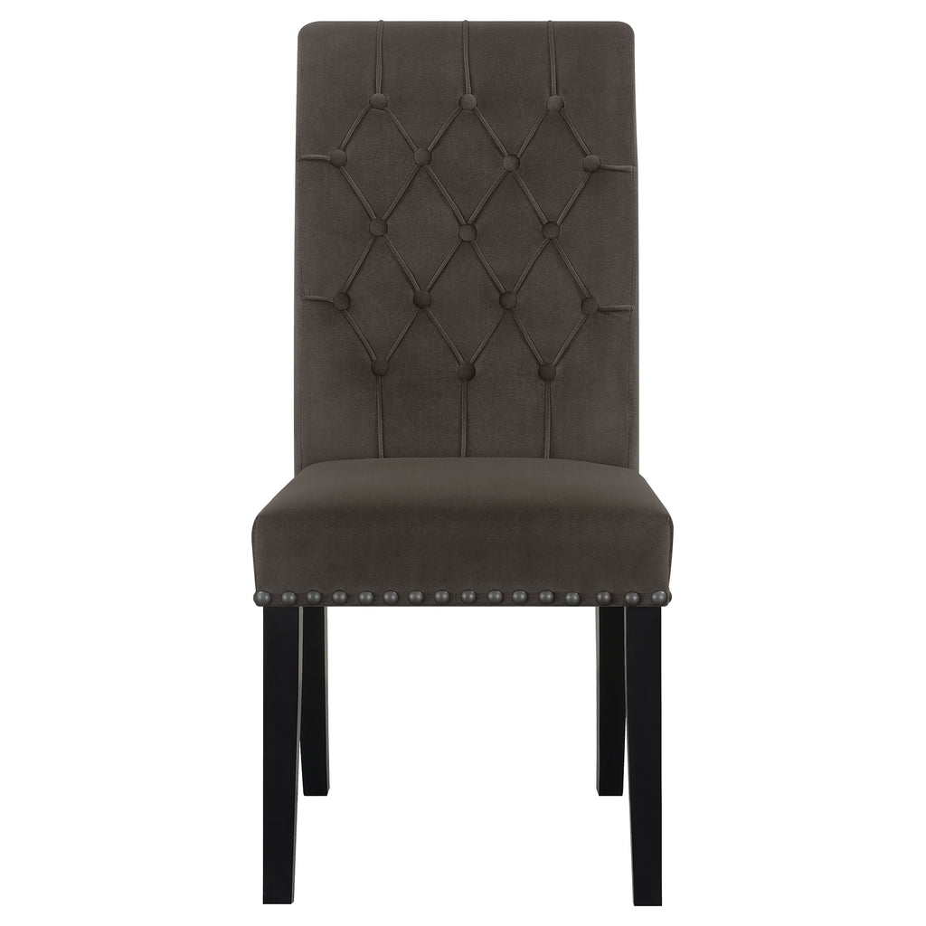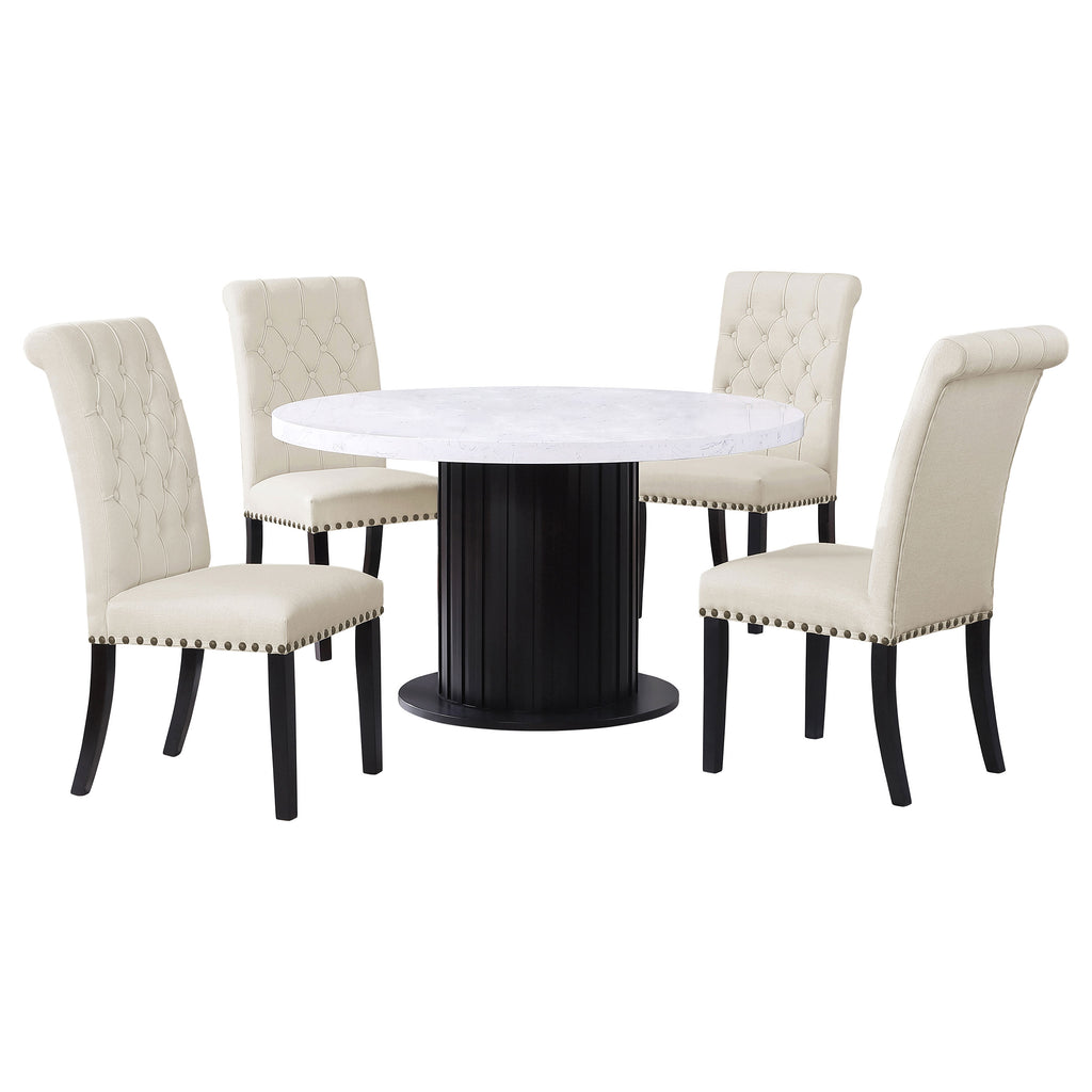 Bring together family and friends at this modern rustic style dining table set. The table features a rectangular, thick, white marble top that is spacious enough for six people. Sleek open and airy trestle base with a center punch out, rustic espresso striking color combination lends a dramatic touch and grounds the room elegantly. The set of chairs with a rolled backrest with button-tufted details lends a traditional aesthetic to a space. Also, bringing to your home the classic elements is a padded seat with individual nailhead trim that offers a charming detail.
